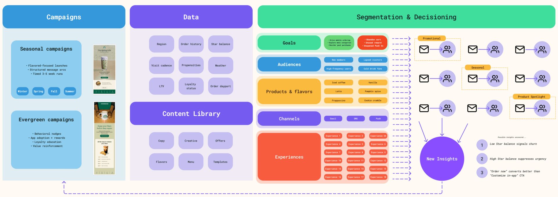 What makes Starbucks’ email program so powerful isn’t just that it feels personal — it’s the sheer volume and consistency of decisioning happening behind the scenes. For every send, they’re making choices around which product or flavor to feature, what offer to include, what creative to use, which channel to activate, and when to deliver. How do they make those decisions? It’s all likely influenced by key signals: think order history, product affinities, star balance, visit cadence, region, and broader trends across the loyalty base.