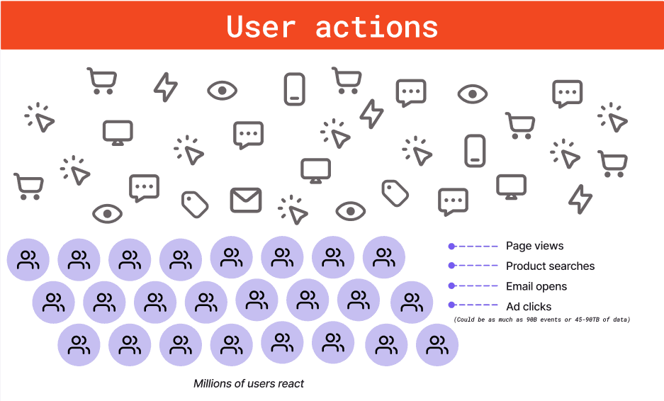 And that is multiplied at an absolutely unprecedented scale. Even with ultra-conservative assumptions — say 150 million active shoppers, assuming each generates around 100 behavioral events per day across six active days — you’re already looking at roughly 90 billion events in under two weeks. According to GPT, that’s anywhere from 45-180 terabytes of data. And this influx of data is critical not only to help them optimize BFCM, but also to shape the next 365 days of their business.