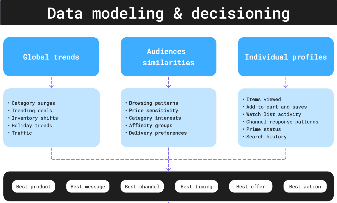 On paper, it sounds really easy to do, but the truth is getting it right requires maniacal focus, rigid discipline, years of learning, and a data infrastructure that actually connects to your lifecycle channels. There are lots of reasons Amazon is such a giant, like the sheer volume of products they offer, quick shipping, and affordability. But one of the most overlooked reasons they win is because their data, decisioning, and personalization operate in perfect harmony, all within a single system.