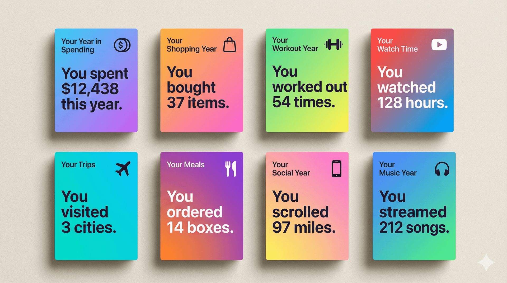 The reality that most companies are uncomfortable admitting is that many year-in-review campaigns simply tell the customer what they did. As a result, they usually end up looking something like this: “You bought XYZ”, “You completed XYZ”, “You spent XYZ”, “You streamed XYZ”.